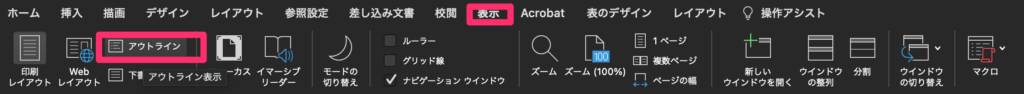 アウトライン機能を使用するには[ 表示] タブを選択して、[アウトライン]を選択します。