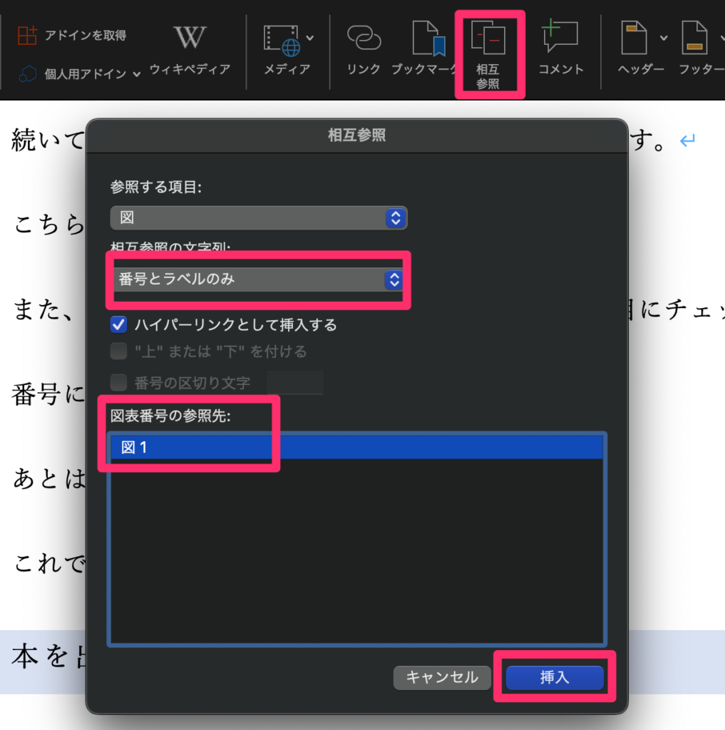 相互参照の使い方は、[挿入]タブから、[相互参照]を選択します。