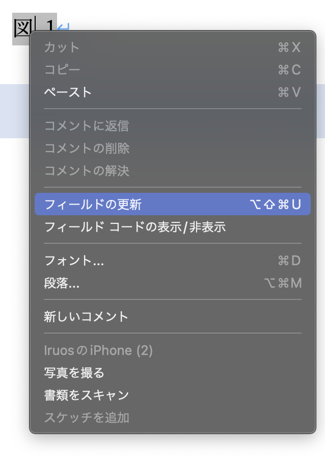 この際に相互参照を設定しておけば、文章を選択して右クリックから更新するだけで、図の番号と本文の番号を合わせられます。