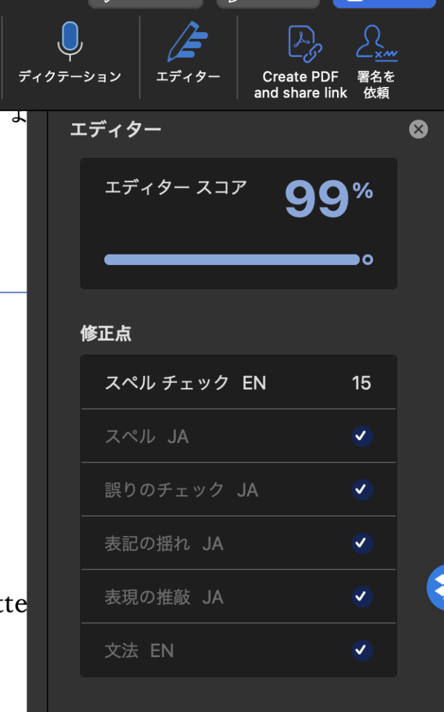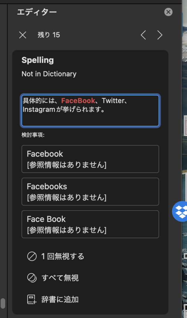 [修正点]の項目(上記の画像では[スペル チェック EN])を選択すると、以下の画像のように修正箇所を確認できます。