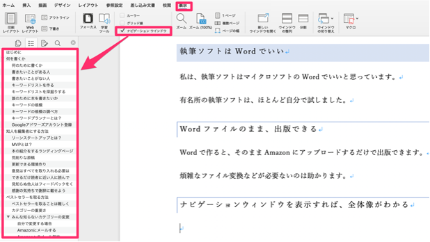 キンドル出版のWordの活用のコツは、全体像がわかるナビゲーションウィンドウ、本の骨格を作るアウトライン、図の更新が楽になる相互参照、参考文献の管理、表記揺れチェックです。