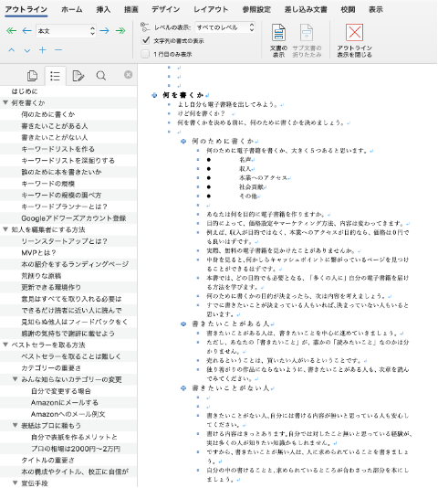 Word活用のコツの2つ目は、本の骨格を作るアウトライン機能の活用です。