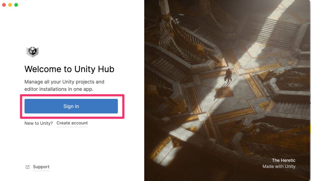 インストールが完了したら、Unity Hubを起動します。Unityアカウントを作成またはログインします。既にアカウントを持っている場合はログインするだけでOKです。