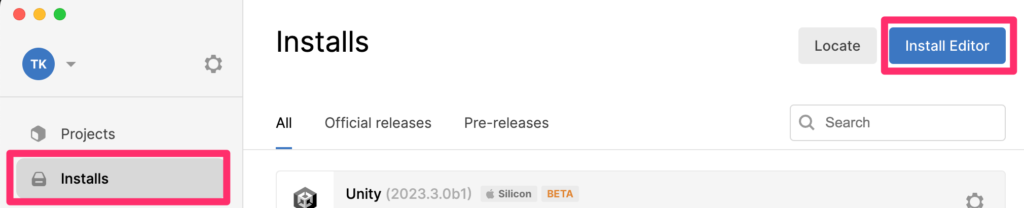 画面左のメニューの[Installs]をクリックし、右上のボタンの[Install Editor]をクリックします。