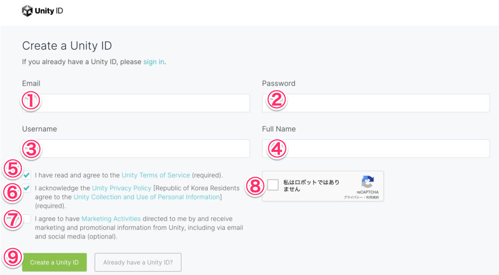 9. [Create a Unity ID]でUnityIDを作成します。