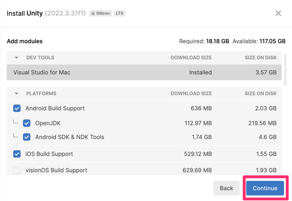 デフォルトでは、[Android build Support]と[iOS Build Support]、[WebGL Build Support]、ドキュメントの[日本語]が選ばれています。