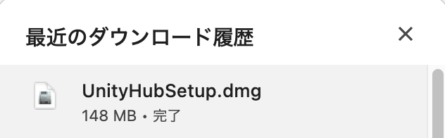 Macの場合は、以下のように[UnityHubSetup.dmg]がダウンロードされます。