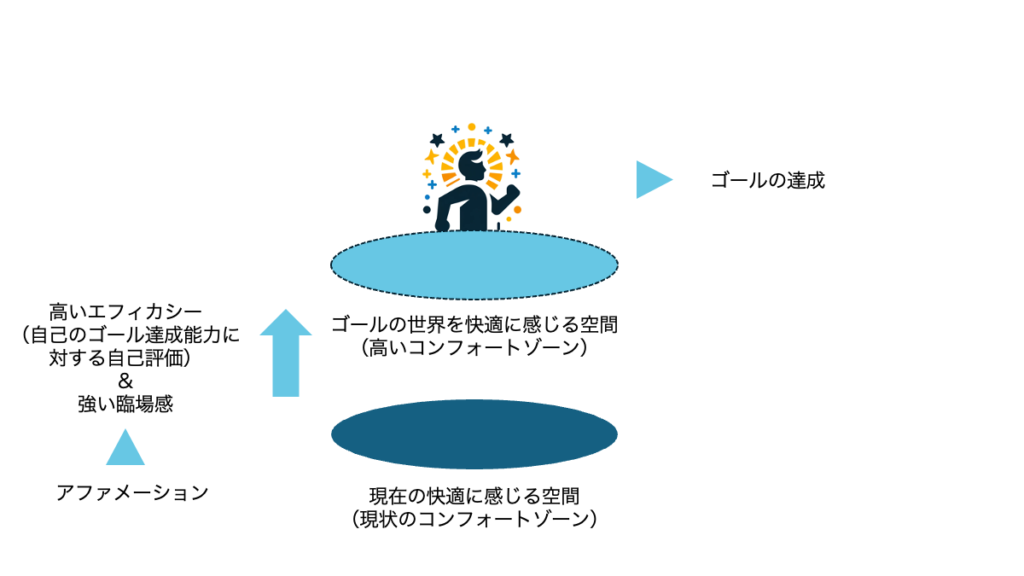 アファメーションを行う目的は、自己のゴール達成能力に対する自己評価(エフィカシー)を高めることと、ゴールに強い臨場感を持つことです。
