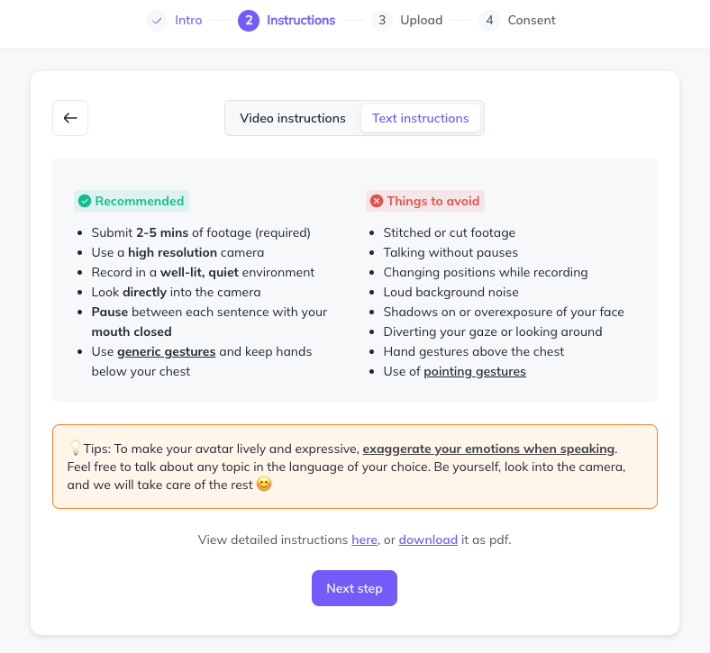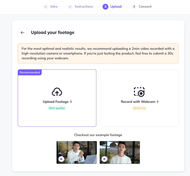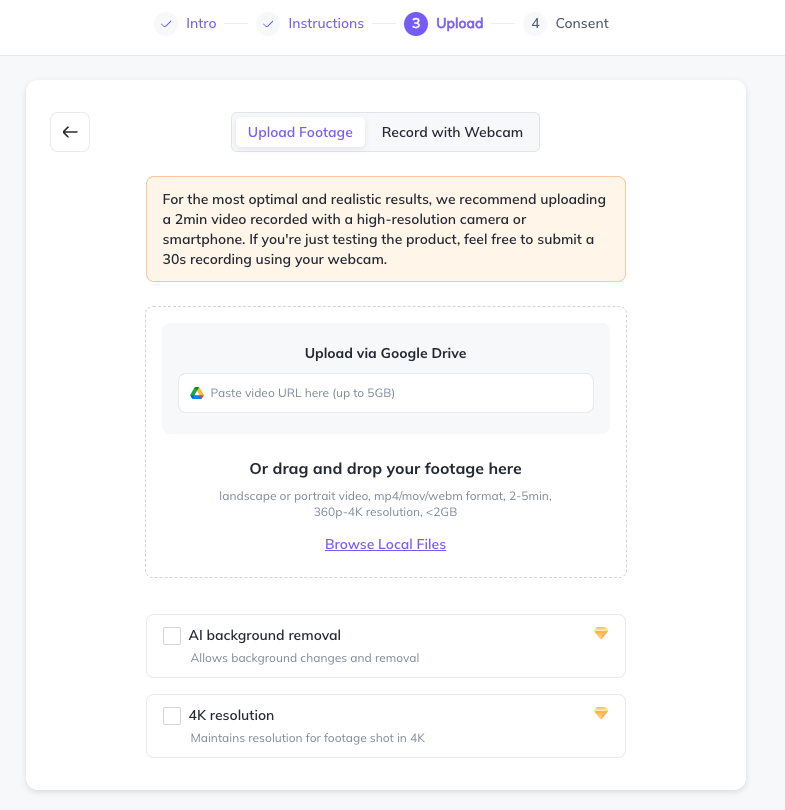 最適でリアルな結果を得るためには、高解像度のカメラやスマートフォンで録画した2分間のビデオをアップロードすることをお勧めします。製品を試すだけなら、ウェブカメラを使用して30秒間の録画を提出しても構いません。
