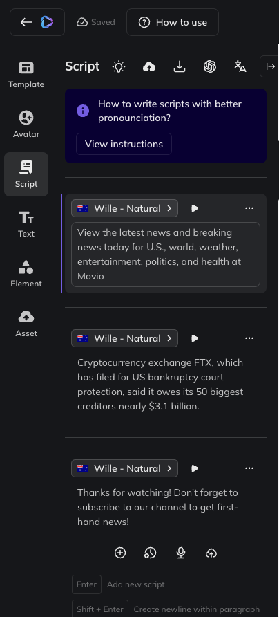 声と音声内容を変更する際は[Script]をClickして編集します。