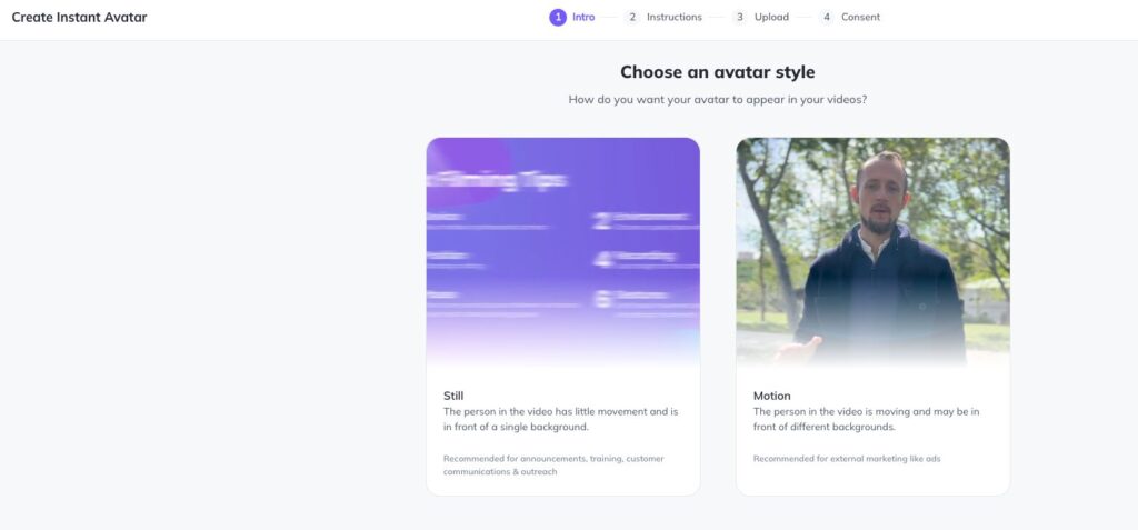 Instant AIアバターでは、2種類のスタイル[Still]か[Motion]を選択します。