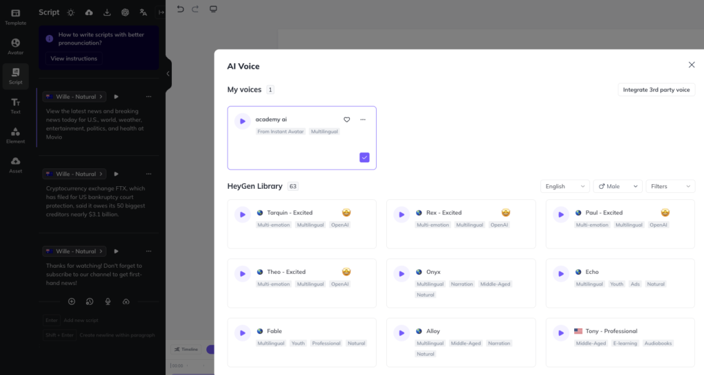 音声は自分の登録した声も使えますし、ライブラリーの中からも選べます。