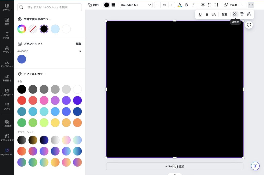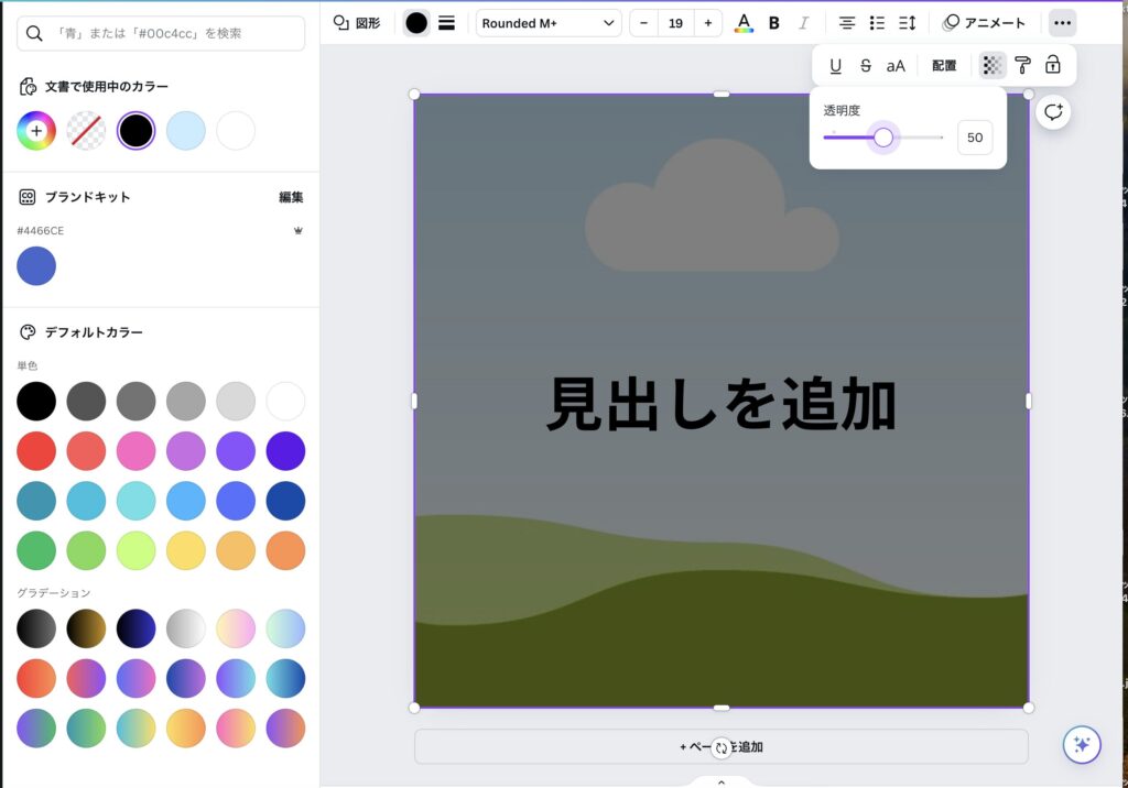 [透明度]をクリックし、画像と文字が見える50に設定します。