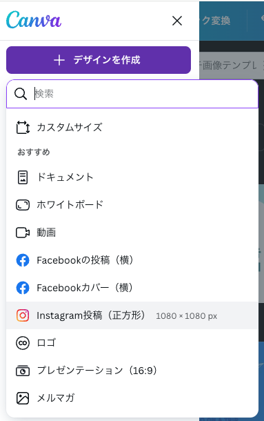 まず[+デザインを作成]から[Instagram投稿]を選びます。