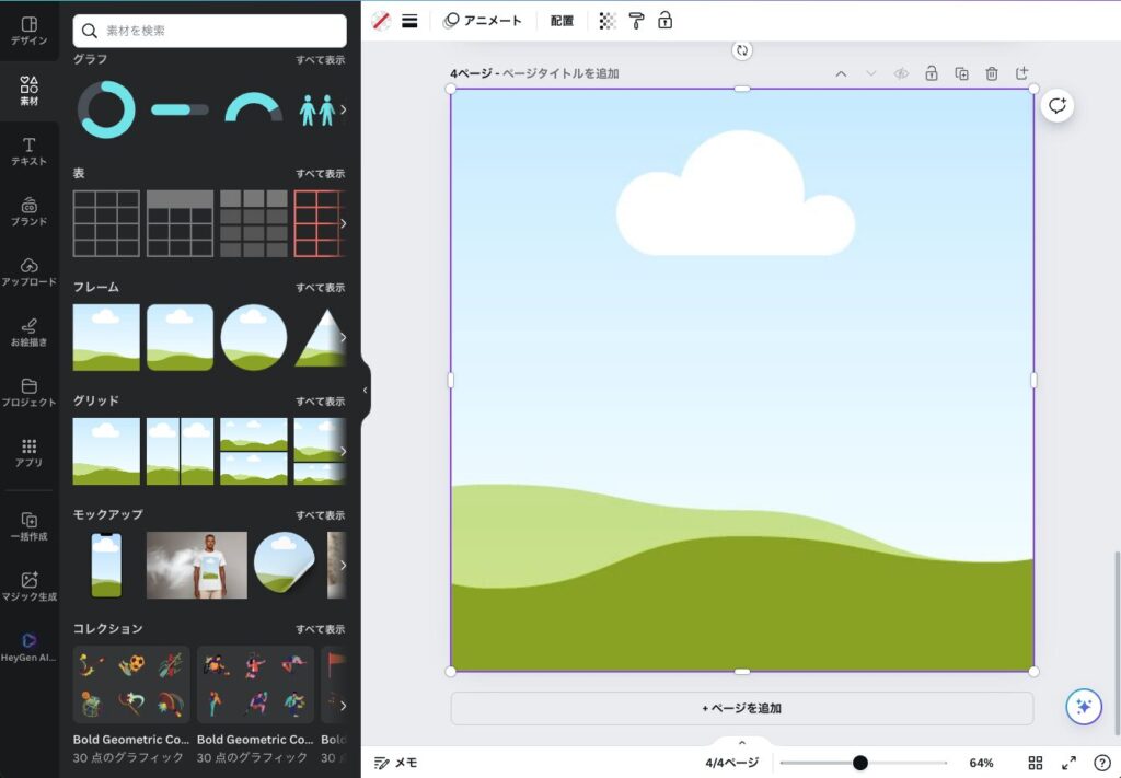 左の[素材]からフレームを選び、画像が挿入される場所を指定します。