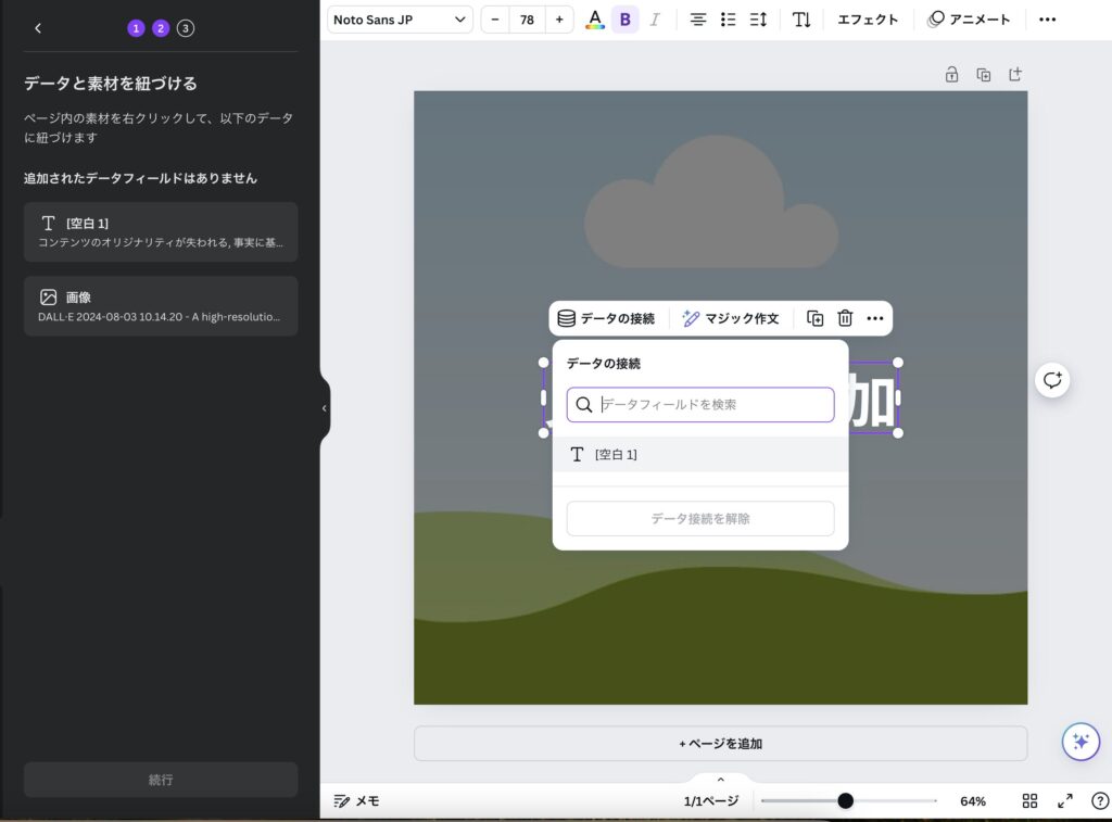 画像を右Clickしてデータの接続を選びデータを接続します。