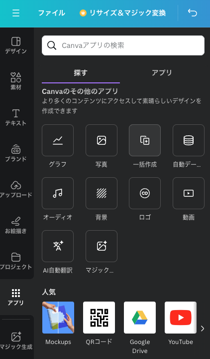 左側の「アプリ」というメニューから「一括作成」というボタンを探します。