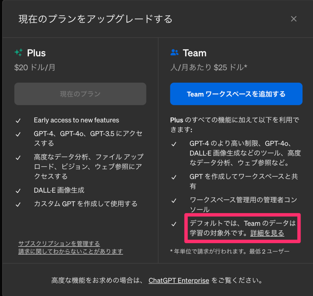 Teamプランでは、より厳格なデータ管理とセキュリティ対策が提供されており、ビジネス利用や機密情報の取り扱いに適しています。