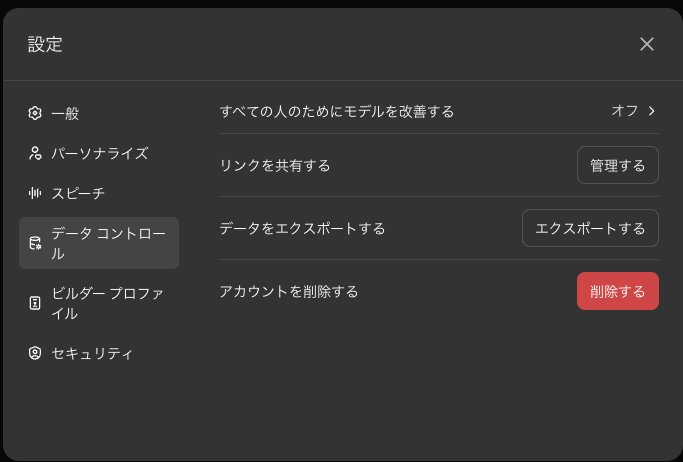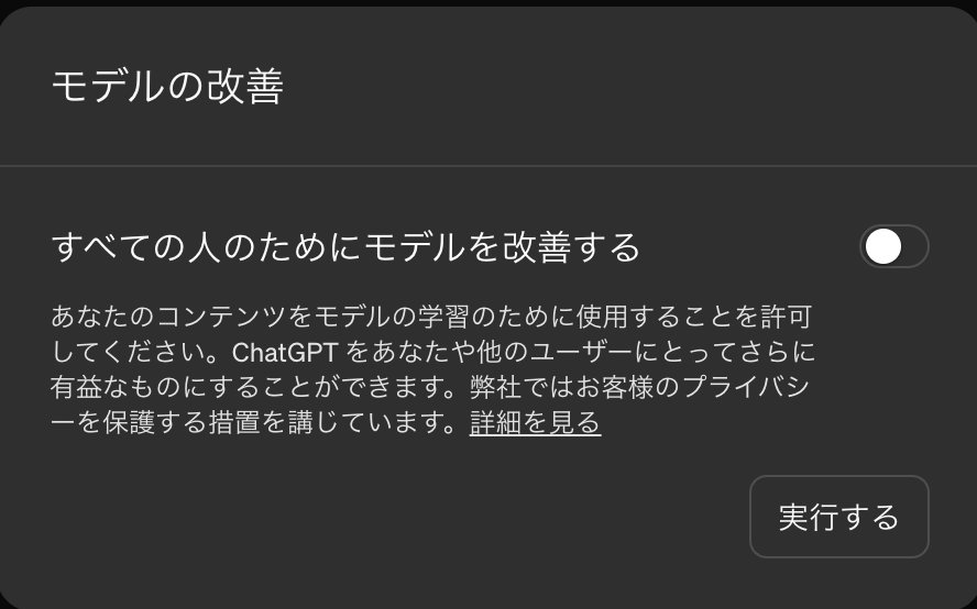 この設定をオフにすることで、入力したデータが今後のモデル改善に利用されることはなくなります。