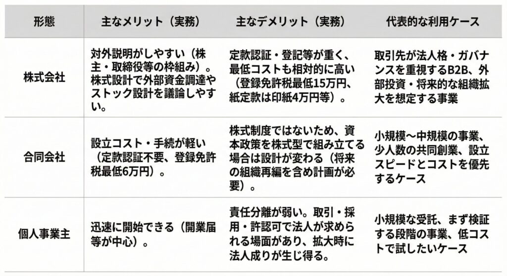 1. まず押さえる:株式会社・合同会社・個人事業主の違い