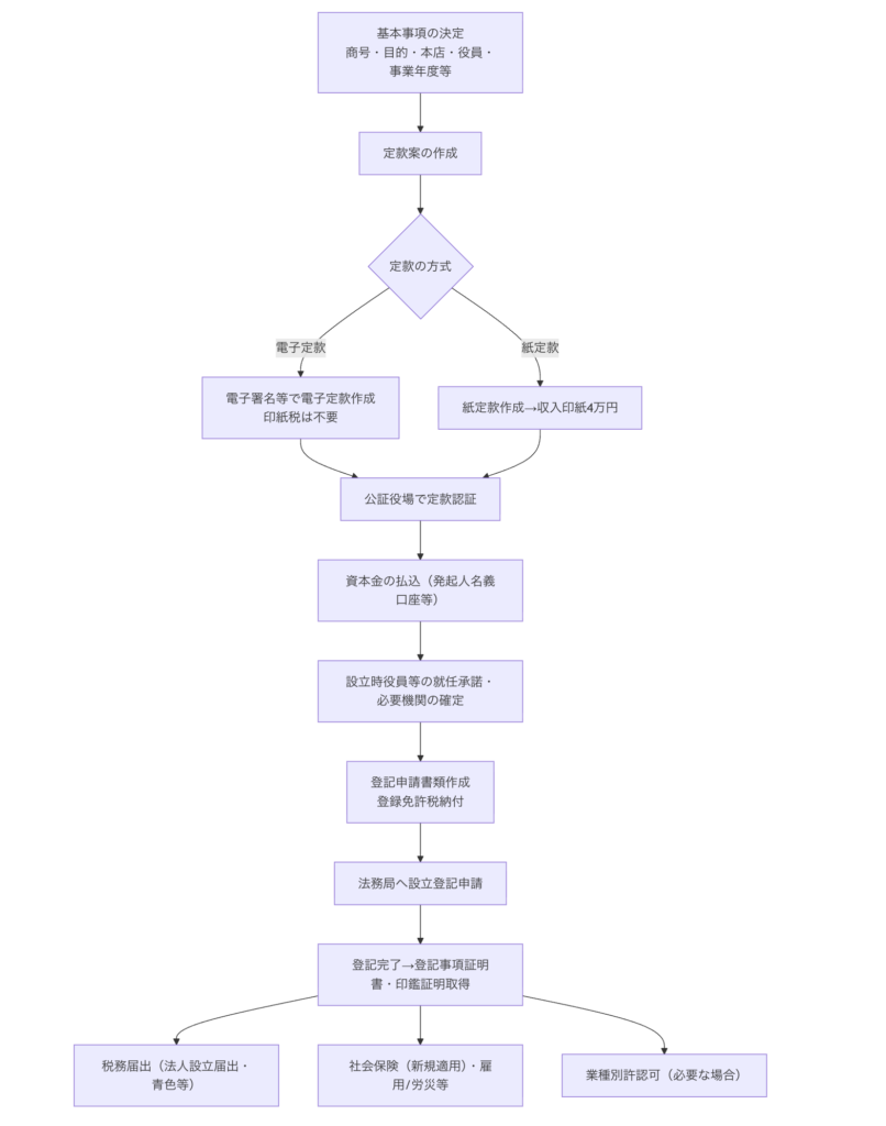 「定款(ルールブック)を作る → 公証人が認証 → 資本金払込 → 登記」