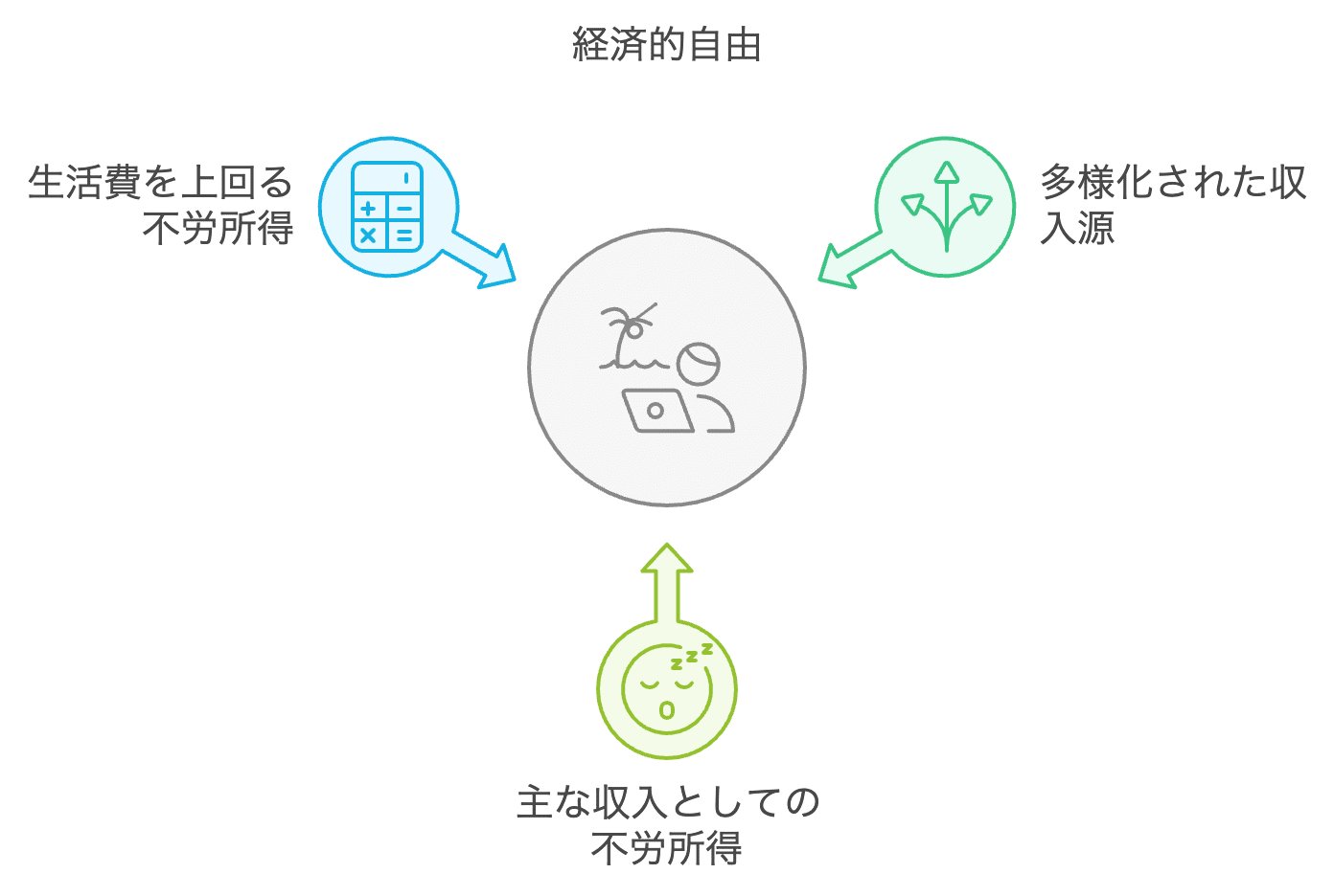 、収入源が多様化され、主な収入が不労所得となり、その不労所得が生活費を上回る状態を指します。この状態に達すれば、働かなくても、あるいは働けなくなっても自由に生きられますし、家族を養い続けることが可能です。