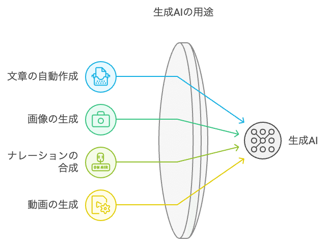 用途としては、文章の自動作成、リアルな画像の生成、ナレーションの合成、動画の生成などがあり、幅広い分野で利用されています。