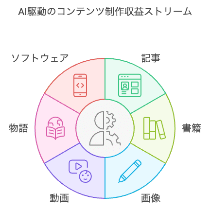 生成AIを活用して収益を得る主要な方法は、コンテンツを生成して販売することです。コンテンツビジネスは生成AIと相性が良く、迅速かつ効率的にさまざまな形式のコンテンツを作成できます。具体的なコンテンツ例としては以下の通りです。