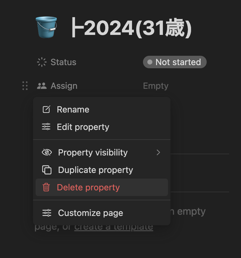 [Assign]プロパティは個人では使用しないため[Delete property]をクリックして削除します。