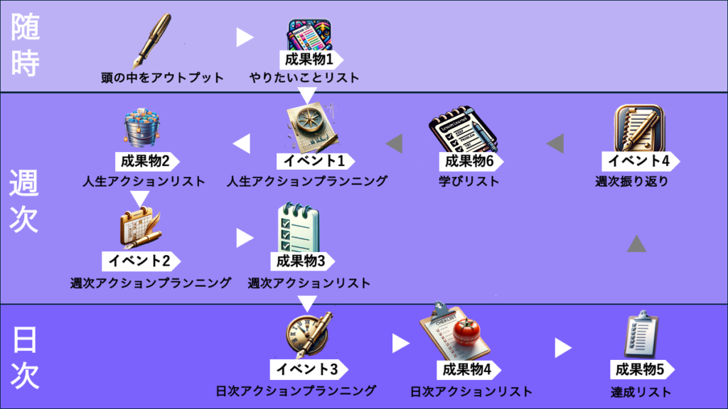 • 人生アクションリスト(優先順位の設定):タスクに優先順位をつけ、重要度に応じて並び替えます。