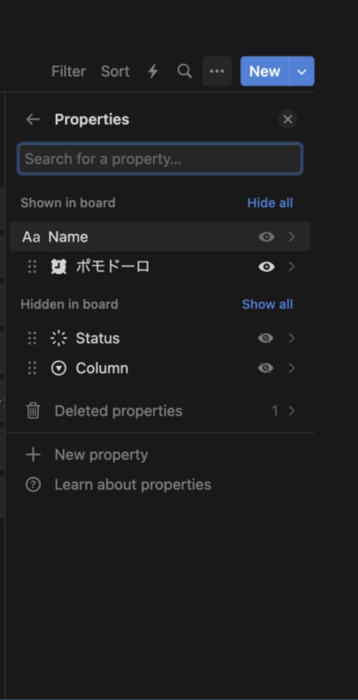 [New]の左の[…]->[Properties]をクリックして、[Select]の「ポモドーロ」を作成します。