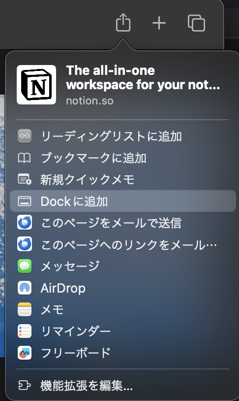 SafariでNotionを開き、Dockに追加をクリックすると、Notionをホーム画面からすぐに開くことができます。