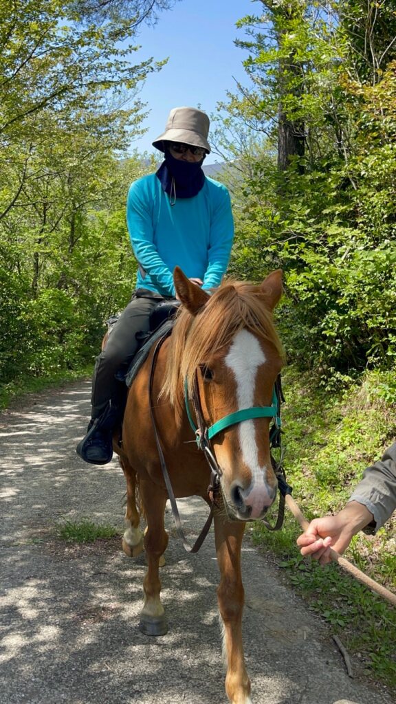 乗馬をして森を歩き、まるで戦国時代の武将のような体験をしました。残念ながら自分は落馬してしまい、怪我をしたため、軍手とヘルメットがあればもっと安心できると感じました。