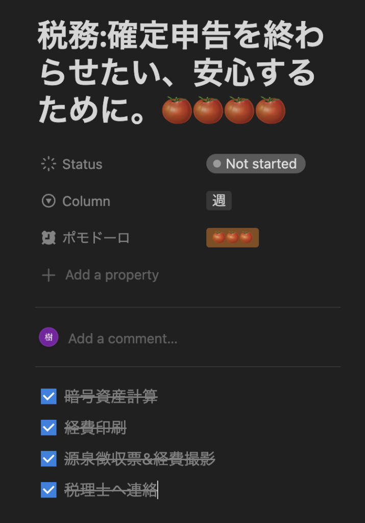 例えば、Notionを使用している場合、各タスクのページにチェックボックスを使ってタスクを細分化し、進捗を明確に追跡できます。